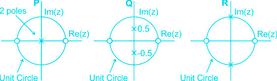 The pole-zero plots of three discrete time systems P, Q and R on the z-plane are shown below.