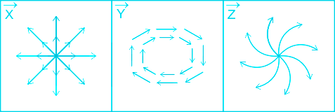 The figures show diagrammatic representations of vector fields \(\vec X,\;\vec Y,\;and\;\vec Z\) respectively. Which one of the following choices is true?