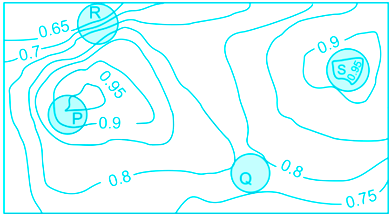 An air pressure contour line joins locations in a region having the same atmospheric pressure. The following is an air pressure contour plot of a geographical region. Contour lines are shown at 0.05 bar intervals in this plot.