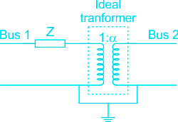The figure shows the per-phase representation of a phase-shifting transformer connected between buses 1 and 2, where α is a complex number with non-zero real and imaginary parts.