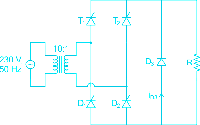 The figure below shows the circuit diagram of a controlled rectifier supplied from a 230 V, 50 Hz, 1-phase voltage source and a 10 : 1 ideal transformer. Assume that all devices are ideal. The firing angles of the thyristors T1 and T2 are 90° and 270° respectively.