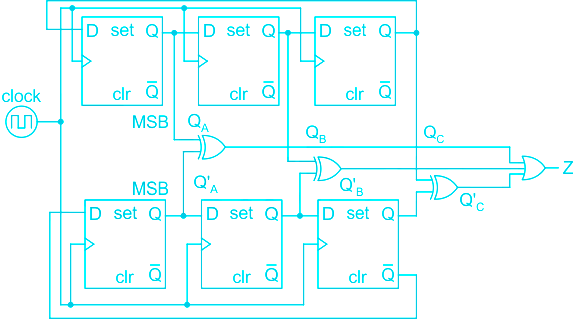 For the synchronous sequential circuit shown below, the output Z is zero for the initial conditions \({Q_A}{Q_B}{Q_C} = Q_A'Q_B'Q_C' = 100\).