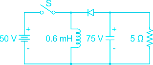 In the circuit shown all elements are ideal and the switch S is operated at 10 kHz and 60% duty ratio. The capacitor is large enough so that the ripple across it is negligible and at steady state acquires a voltage as shown. The peak current in amperes drawn from the 50 V DC source is _________. (Give the answer up to one decimal place.)