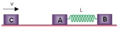Two blocks A and B, each of mass m, are connected by a massless spring of natural length L and spring constant k. The blocks are initially resting on a smooth horizontal floor with the spring at its natural length, as shown in the figure. A third identical block C, also of mass m, moves on the floor with a speed v along the line joining A and B, and collides elastically with A. Then,