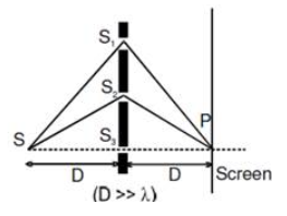 A monochromatic light source of wavelength λ is placed at S. Three slits S1, S2 and S3 are equidistance from the source S and the point P on the screen. S1P − S2P = λ/6 and S1P − S3P = 2λ/3. If I be the intensity at P when only one slit is open, the intensity at P when all the three slits are open is?