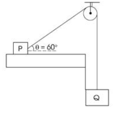 Two blocks P and Q are connected by a light inextensible string passing over a smooth pulley fixed as shown in the Figure. The coefficient of friction of blocks P and Q to the table is μ = 0.3; the mass of the block Q is 20 kg. The mass of the block P for the block just to slip is