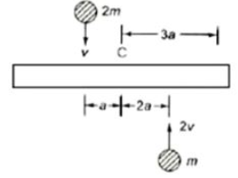 A uniform bar of length 6a and mass 8m lies on a smooth horizontal table. Two point masses m and 2m moving in the same horizontal plane with speed 2 v and v, respectively, strike the bar [as shown in the figure] and stick to the bar after collision. Denoting angular velocity (about the centre of mass), total energy and centre of mass velocity respectively by ω , E and vc, we have after collision: