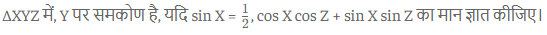 In ΔXYZ, right angled at Y, if sin X = 1/2, find the value of cos X cos Z + sin X sin Z.