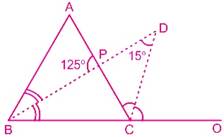 ΔABC में, आंतरिक ∠B और बाह्य ∠C के समद्विभाजक D पर मिलते हैं। यदि ∠BDC = 15° है, यदि ∠APB 125° है तो कोण ∠ABC ज्ञात कीजिए।