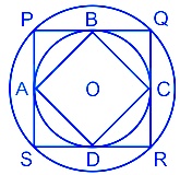 नीचे दिया गया चित्र केंद्र O वाले दो संकेंद्रित वृत्तों को दर्शाता है। PQRS बाहरी वृत्त में अंकित एक वर्ग है। यह बिंदु B, C, D और A पर स्पर्श करते हुए, आंतरिक वृत्त को भी परिगत करता है। वाह्य वृत्त की परिधि का बहुभुज ABCD की परिधि से अनुपात क्या है?