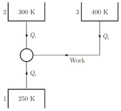 A vapour absorption refrigeration system is a heat pump with three thermal reservoirs, as shown in the figure. A refrigeration effect of 100 W is required at 250 K when the heat source available is at 400 K. Heat rejection occurs at 300 K. The minimum value of heat required (in W) is (Answer up to the nearest integer)