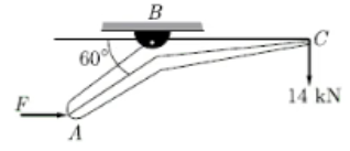 A bell-crank lever ABC is pivoted at B and carries a weight 14 kN at C as shown in figure. Take AB = 21 cm and BC = 30 cm. The horizontal force F (in kN) necessary to prevent turning of the lever, is _______. (Answer up to two decimal places)