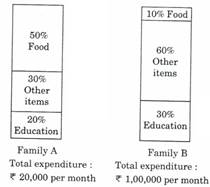 The proportion of expenditure on various items by two families A and B are represented in the following Bar Charts: