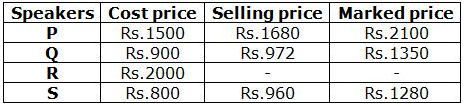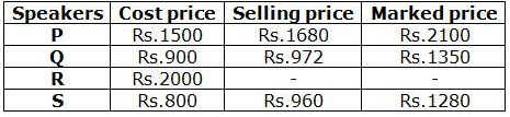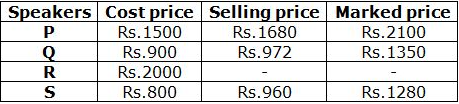 The selling price of speaker Q = 1350 * (100 – 28)/100 = 1350 * (72/100) = Rs.972