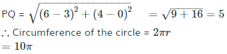 In a plane, P and Q are two points having co-ordinate (3, 0) and (6, 4) respectively. Then the numerical value of the circumference of circle with radius PQ is: