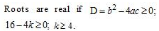 Roots are real if D = b2 – 4ac = 0; 36k2 – 144 = 0; k2 = 4,