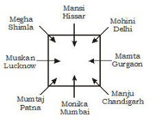 Eight friends Mansi, Mohini, Manju, Mamta, Monika, Muskaan, Mumtaj and Megha are sitting around a square table but not necessarily in the same order. All are facing the centre. Each of them are from different cities, viz.- Hissar, Mumbai, Delhi, Chandigarh, Gurgaon, Patna, Lucknow, Shimla (not necessarily in the same order).
