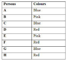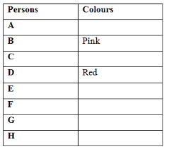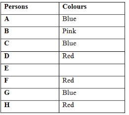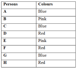 Eight persons A, B, C, D, E, F, G and H likes three different colours. Not more than three persons like same colour. Three different colours are Pink, Blue, Red are not necessarily in the same order.