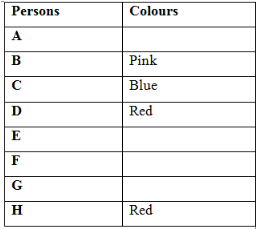 B likes pink colour. D likes Red colour. H does not like Blue colour. C does not like Red colour. Only B and other person like pink colour. Both C and H does not like pink colour. Both A and G likes same colour. F does not likes pink colour.