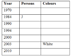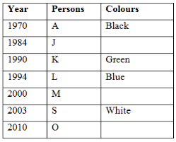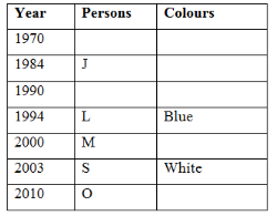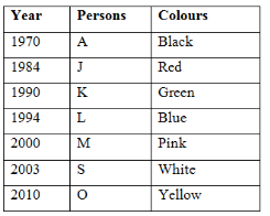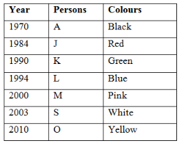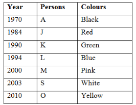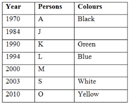 Seven persons A, J, K, L, S, O and M are born in seven different years, are 1970, 1984, 1990, 1994, 2000, 2003 and 2010. They like different colours are Green, Black, Blue, Pink, Yellow, White and Red. No two persons like same colour and no two persons born in same year. Not necessarily in the same order.