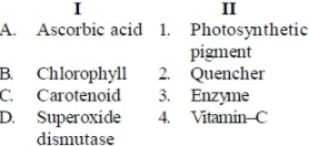 The correct match is as follows: Ascorbic acid- Vitamin C Chlorophyll- Photosynthetic pigment Carotenoid- Quencher Superoxide dismutase- Enzyme