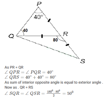 PQR is a triangle in which PR =QR. Side PR is extended to S, such that QR = RS. If ∠QPR = 40∘, then what is the value (in degrees) of ∠ QSR ?