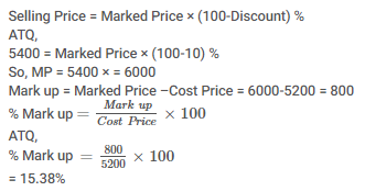 Selling and cost price of an article are Rs 5400 and Rs 5200 respectively. If 10% discount was given, then what is the percentage mark up?