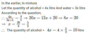 A mixture contains alcohol and water in the ratio 4 : 3. If 5 litre of water is added to the mixture, the ratio becomes 4: 5. The quantity of alcohol in the given mixture is–