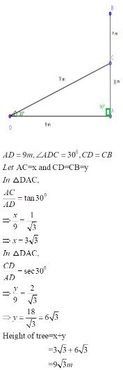 A tree breaks due to storm and the broken part bends so that the top of the tree touches the ground making an angle of 30o with it. The distance between the foot of the tree to the point where the top touches the ground is 9m .Find the height of the tree.