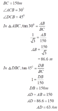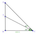The angle of elevation of the top of an unfinished pillar at a point 150 m from its base is 30o. If the angle of elevation at the same point is to be 45o ,then the pillar has to be raised to a height of how many metres?