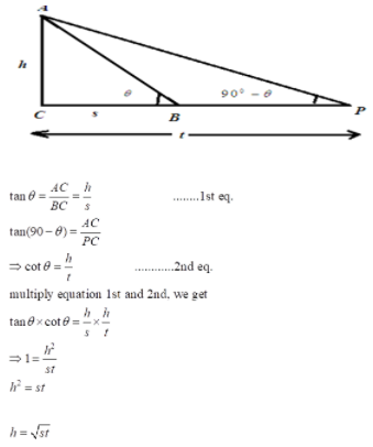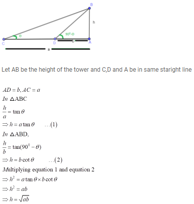 If the angles of elevation of the top of a tower from two points at distances a and b from the base and in the same straight line with it are complementary then the height of the tower is