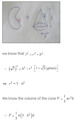 A cone is made from a circular sheet of radius √3 by cutting out a sector and keeping the cut edges of the remaining piece together. Then find the maximum volume attainable for the cone.