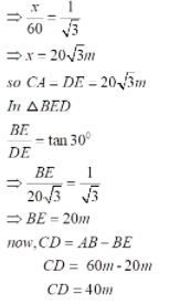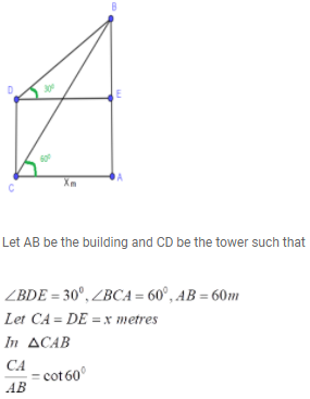 From the top of a building 60m high, the angles of depression of the top and bottom of a tower are observed to be 30o and 60o.Find the height of the tower.