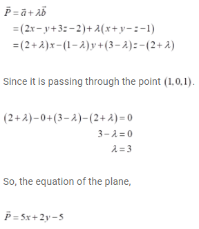 A plane P passes through the line of intersection of the planes 2x - y + 3z = 2,x + y - z = 1 and the point (1, 0, 1).