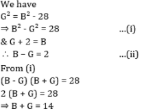 There are some boys and some girls in a room. The square of the number of girls is 28 less than the square of the number of boys. If there were two more girls then the number of boys and girls would have been same. What is the total number of boys and girls in the room?