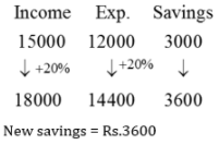 Krishnamoorthy earns Rs 15000 per month and spends 80% of it. Due to revise in salary his monthly income has increased by 20% but due to price hike he has to spend 20% more. What is his new savings?