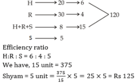 Hari and Ravi accepted to complete a work in Rs 375. Hari alone can complete that work in 20 hours and Ravi alone can complete that work in 30 hours. With the help of Shyam they complete the work in 8 hours then how much labour charge should they give to Shyam?