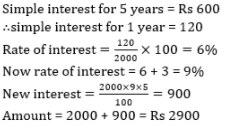 Rs. 2000 amounts to Rs 2600 in five years at a certain rate of simple interest. If the rate of interest is 3% more than the previous rate, then in the same time period, the same sum will amount to