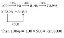 The price of motor cycle depreciates every year by 10%. If the value of the motor cycle after 3 years will be Rs 36450, Then what is the present value (in Rs) of the motor cycle?