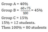 In a college, 40% of the students were allotted group A, 75% of the remaining were given group B and the remaining 12 students were given group C. Then the number of students who applied for the groups is