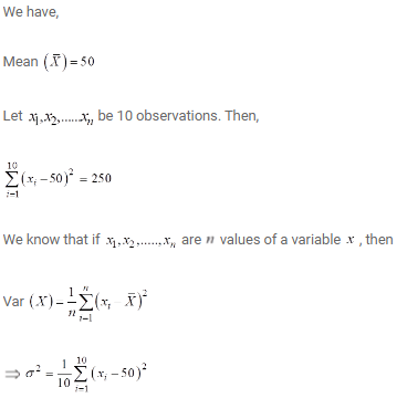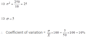 The Sum of the square deviations for 10 observations taken from their mean is 50 is 250. The coefficient of variation is