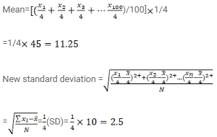 The mean of 100 observations is 50 and the standard deviation is 10. If 5 is subtracted from each observation and then it is divided by 4, then what will be the new mean and the new standard deviation respectively?