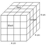 A cube of each side 4 inches, has been painted black, red and green on pars of opposite faces. It is then cut into small cubes of each side 1 inch.