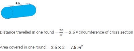 A heavy metallic cylindrical roller of length 3 m is being used in road construction. It takes eight complete rounds to roll a distance of 20 m. What area of the road it covers in one round?