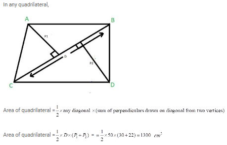 In a quadrilateral, the length of one of its diagonal is 50 cm and the perpendiculars drawn on this diagonal from the other two vertices measure 30 cm and 22 cm respectively. Find the area of the quadrilateral.