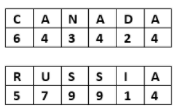 If CANADA is written as 643424 and RUSSIA as 579914, how will INDIA be written?