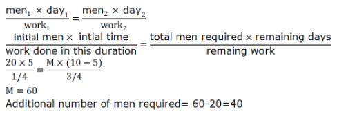 20 men are supposed to complete a work in 10 days. After working for 5 days, they realise that only one–fourth of the work is done. How many more men they need to employ to finish the work on time?