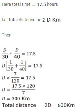 A motor car does a journey in 17.5 hours, covering the first half at 30km/hr and the second half at 40 km/hr, Find the distance of the journey.