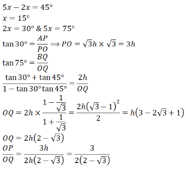 The ratio of heights of two towers stand at P and Q respectively is √3:2. The angle of elevation of a point O in the line joining P and Q to the top of bigger tower to that of smaller tower is 5:2. If difference between the elevations is 45°, the ratio of the distances of O from P to Q is: