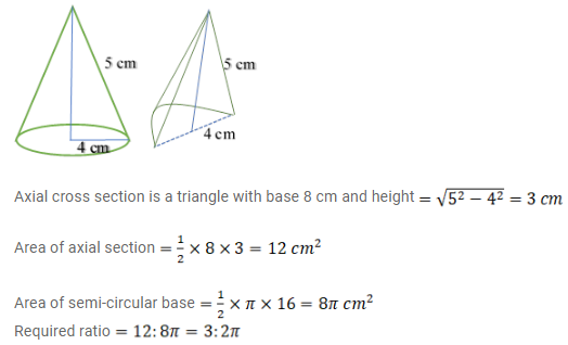 A right circular cone whose diameter and slant height are 8 cm and 5 cm respectively has been cut axially. What is the ratio of area of axial cross section to that of semi-circular base?